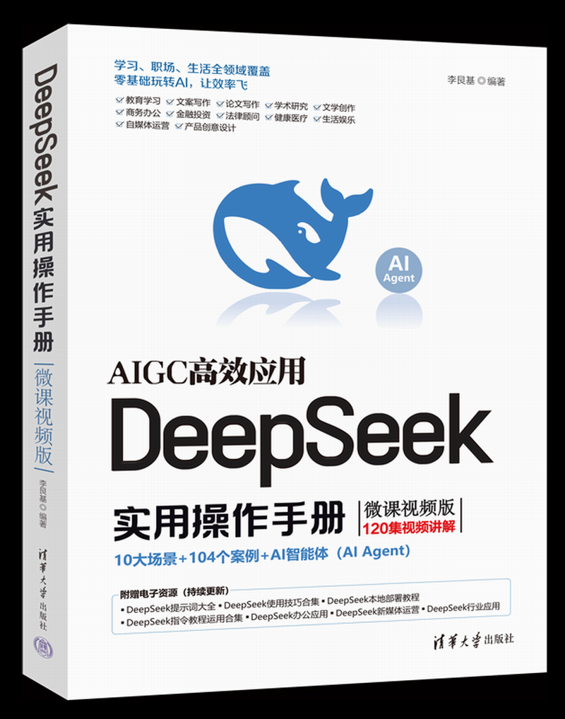 《DeepSeek实用操作手册(微课视频版)》是由李艮基编著、清华大学出版社于2025年4月出版的AI工具应用指南,定价69.80元,配套微课视频辅助学习。该书以国产AI工具DeepSeek为核心,构建“基础操作+场景实战+创新应用”三维教学体系,通过100余个案例覆盖办公商务、文学创作、学术研究、金融医疗数据分析、生活服务智能穿搭推荐、品牌运营等十大高频场景,包含智能生成会议方案、诗歌剧本创作、文献分析、短视频矩阵搭建等实用功能,支持与Office、剪映等20余款软件的无缝衔接 [1-2]。全书分为DeepSeek入门、文学创作与文案写作、办公与商务应用等章节,主要面向职场新人、教育工作者、学术研究者、内容创作者及企业管理者