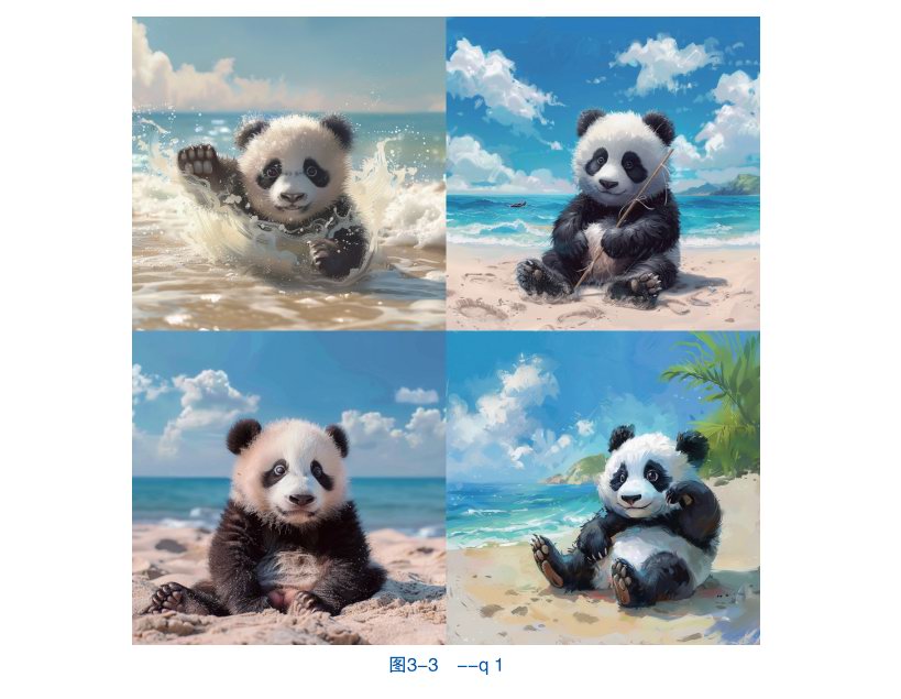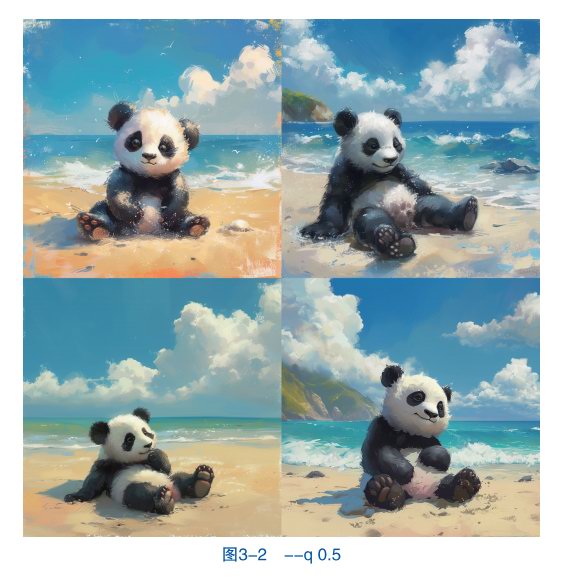 作者在书中提供满满的技术干货的同时,还兼顾引导读者的创作思路和方法。比如图像质量的设置(图像质量:--q或--quality),大部分用户以为q值越大则质量越高,但是作者提出,并非q值越大生成的图像越好,而是在内容上要突出细节表现力时才提高q值,尤其适合毛发、运动或复杂场景。