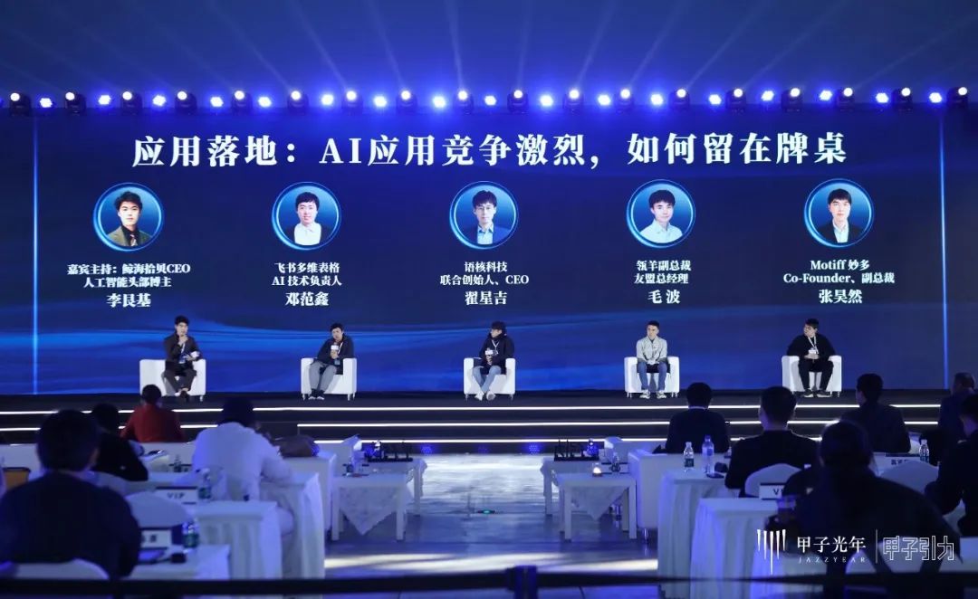 在针对2024年最受关注的AI应用话题,飞书多维表格 AI 技术负责人邓范鑫,语核科技创始人兼CEO 翟星吉,瓴羊副总裁、友盟总经理毛波,Motiff 妙多Co-Founder、副总裁 张昊然以及嘉宾主持人鲸海拾贝CEO、人工智能头部博主李艮基以《应用落地:AI应用竞争激烈,如何留在牌桌》为主题展开了一场圆桌对话,围绕AI应用的落地实践进程与商业化发展展开了深入探讨。