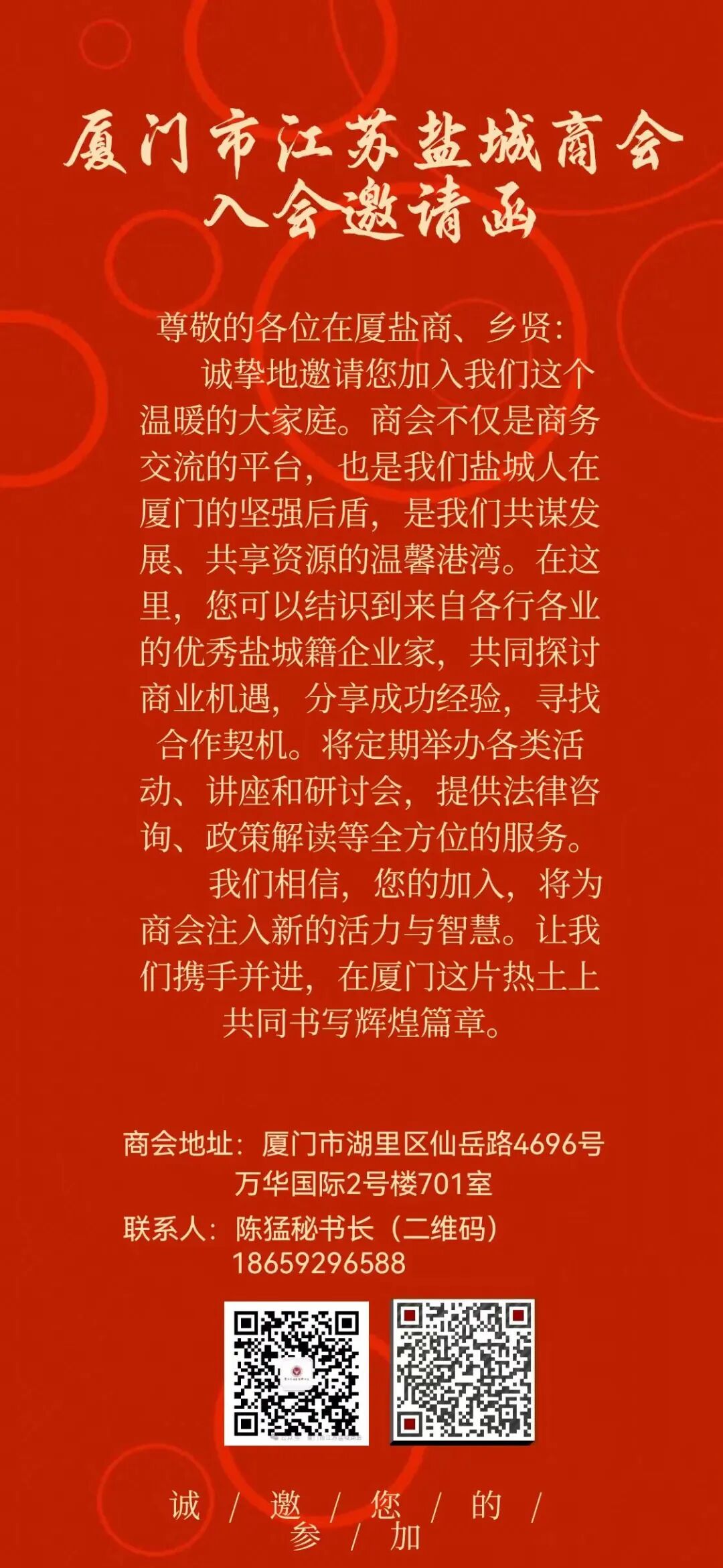 新征程已经开启,厦门市江苏盐城商会将承载着家乡的期望与全体会员的信任,继续扬帆远航,与全国盐商一道,共创美好未来!