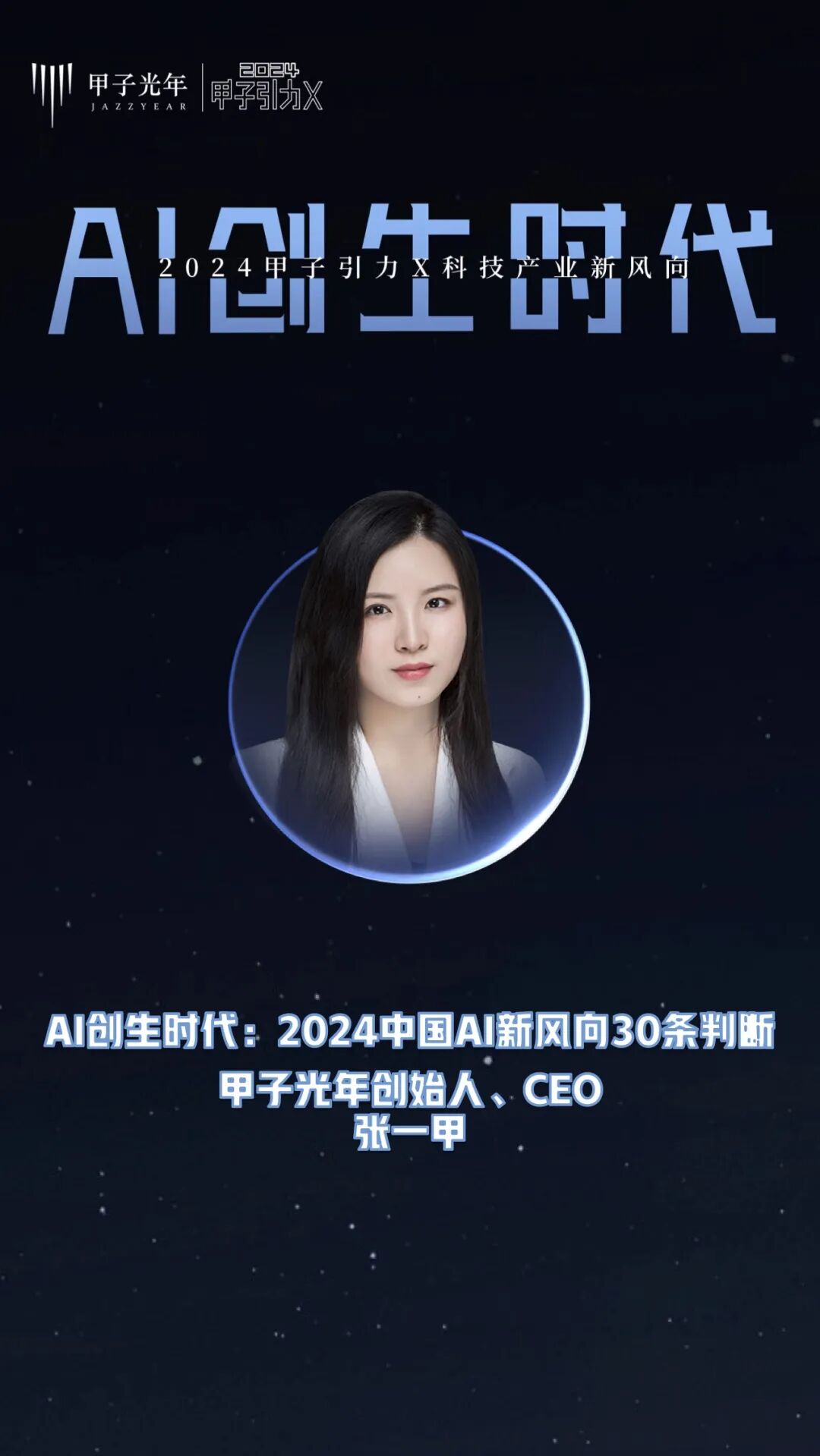大会开场,甲子光年创始人、CEO张一甲将重磅发布2024智库趋势报告《AI创生时代:2024中国AI新风向30条判断》。