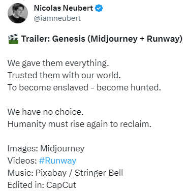 有大佬分享了自己用Midjourney+Runway制作的“电影预告片”《Genesis》(《创世纪》),在社交平台上火得一塌糊涂。