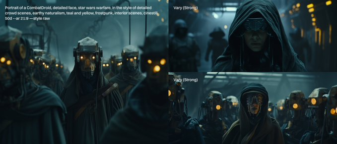 使用Midjourney的“Strong Variations”功能,则让所有的场景生成变得更简单,因为它可以减少提示词的情况下保持之前的调色板。比如下面这三张不同的图几乎不用修改什么提示词。