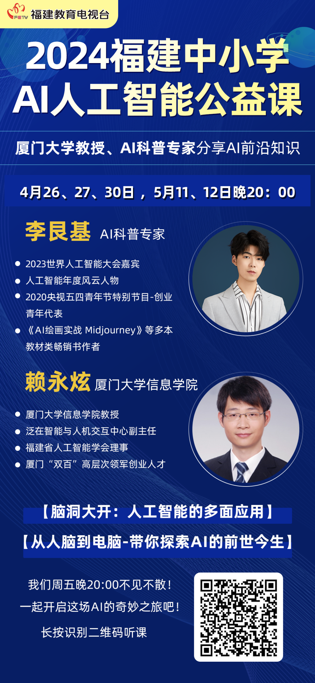 4月26日起,由厦大教授赖永炫老师、AI行业专家李艮基老师联袂分享AI核心知识:人工智能基础概念的普及、人工智能的发展史及基本原理、人工智能应用体验、创新思维的培养,AI 创作的学习等。