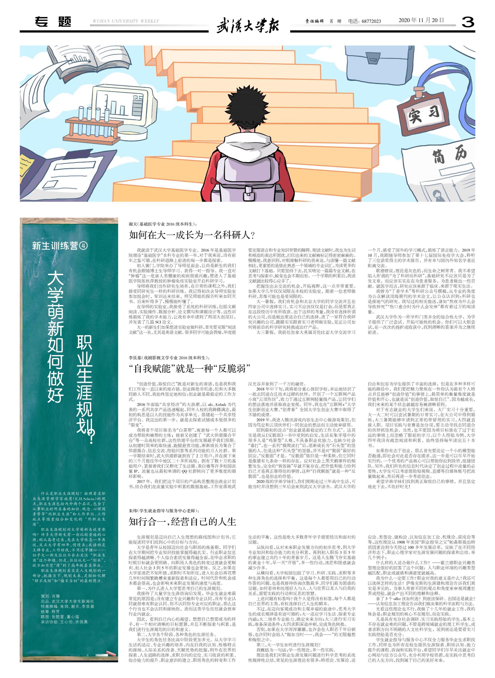 2020级的学弟学妹们,你们刚刚走过三年高中生活,可能当时并没想到三年后会来到武汉大学读书。武汉大学的自由和包容为学生提供了丰富的选择,但是在多种多样可能的路径中,我们要把精力聚焦在一件你认为最有个人特点并且能够“创造价值”的事情上,最简单的衡量维度就是价值和开心,也就是说“创造价值,取悦自己”。因为越成长,我们未来的某个状态就越容易被清晰看到。