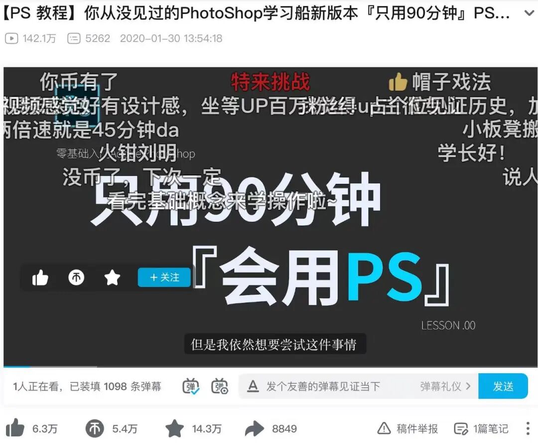 依托B站,GenJi也成为了一个更好的分享者。他的第一条视频是PS教程,“只用90分钟学会PS”,他在里面分享了自己使用心得。视频中午录制,下午剪辑,发布后,在站内获得了142万的播放量。